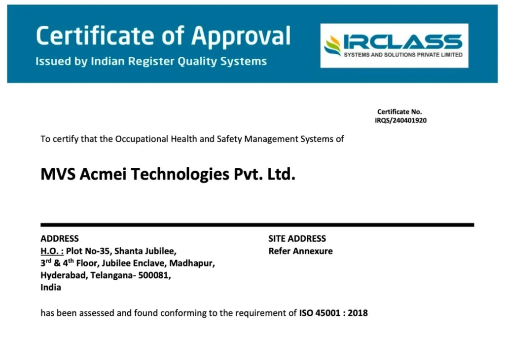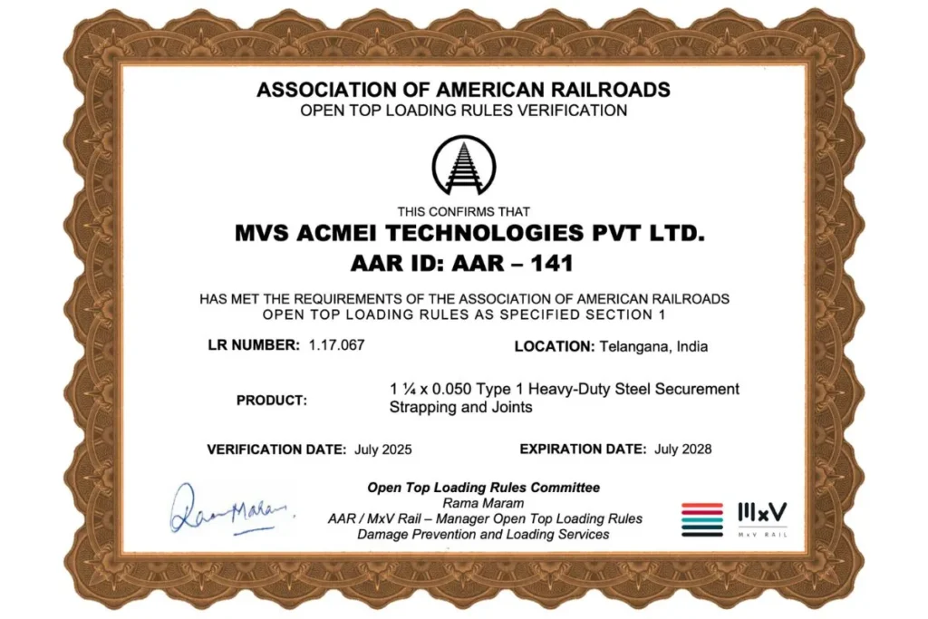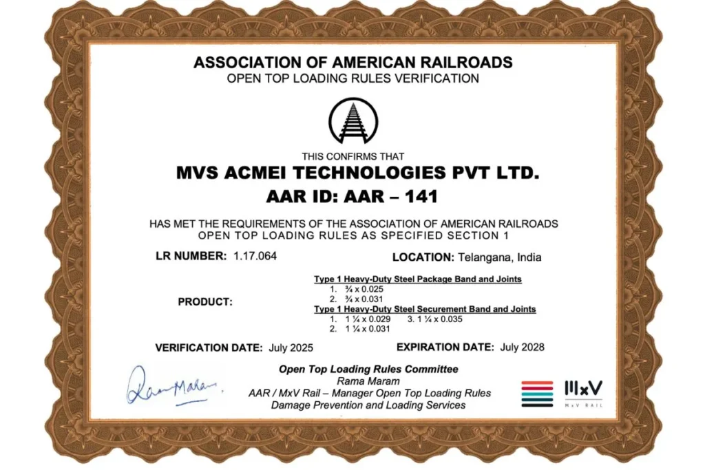 Certifications BIS LICENSE Validity: 5 August 2026 ISO-Environmental Management System -IRCLASS ISO 14001 Validity: 27 April 2026 MVS Acmei AAR OTLR Steel 5 straps Validity: July 2028 MVS Acmei AAR OTLR Steel 1450 Validity: July 2028 MVS ACMEI Technologies ohsms rva Validity: 21 July 2027